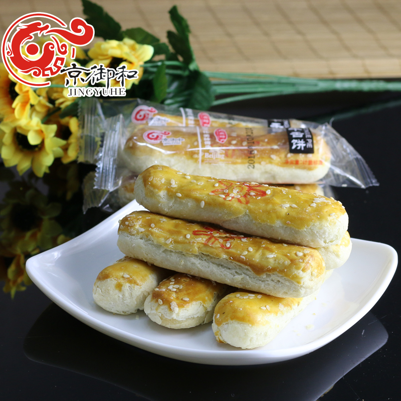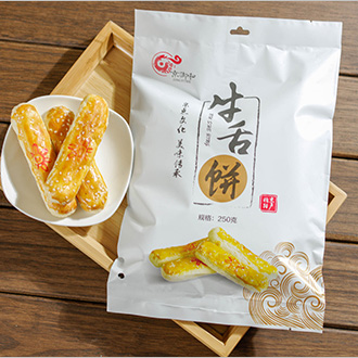 牛舌饼,因形如牛舌而得名,是北京小吃中一种常见的烤制类品种。表面为金黄色,长条形,长短齐整一致,馅内有花椒粉、糖、盐等,口感酥松棉软,馅芯细腻油润,具有五香味道。甜咸可口。