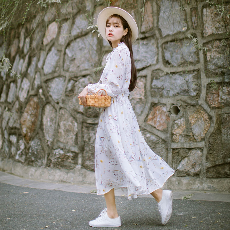 清新印花连衣裙 小v的荷叶领不动声色的修饰了脸部线条 袖口束起小小的花瓣袖,温柔甜美 松紧腰设计不限身材