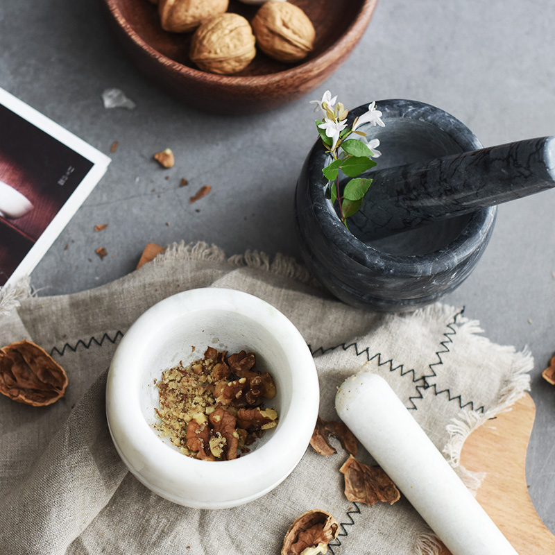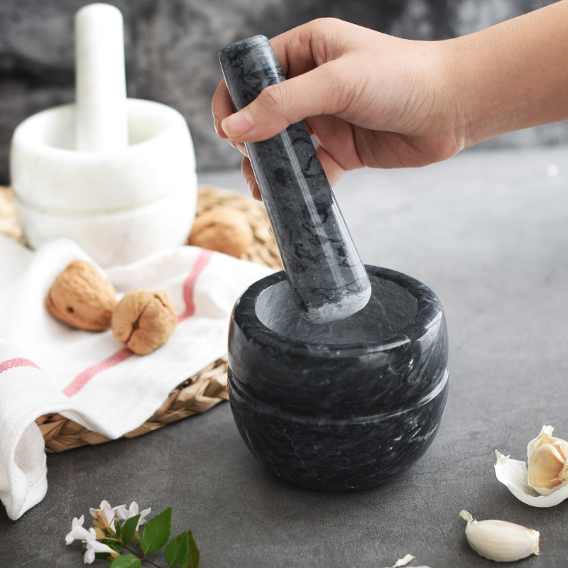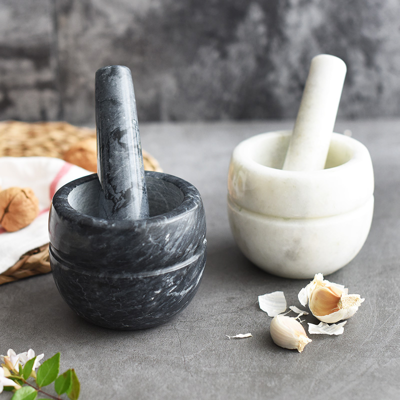 店里新到的大理石质蒜臼子,纹理清晰,手感细腻,黑白两色各具特色,用来捣蒜泥、芝麻、核桃等食材轻松省力。这些年也时兴起一些其他材质的蒜臼子,比如木质、不锈钢、陶瓷的,但是效果都不怎么好,总归还是传统的石头蒜臼子好,愿你也同样喜爱~