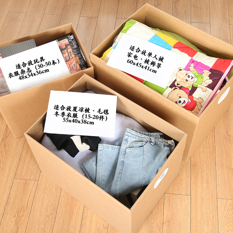 三层美卡纸板是进口纸板,颜色漂亮硬度好,含塑料手扣,适合家居收纳用!五层BE楞是五层纸板做的箱子,含塑料扣手,厚度厚些,适合搬家用!樟木条不算一件箱子哦!!请注意注意