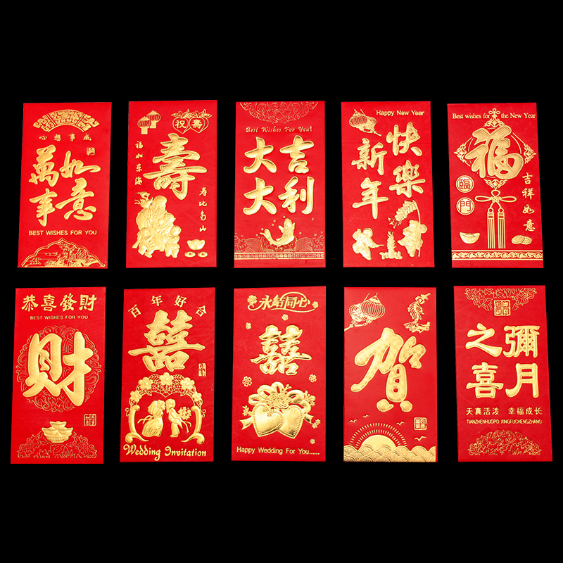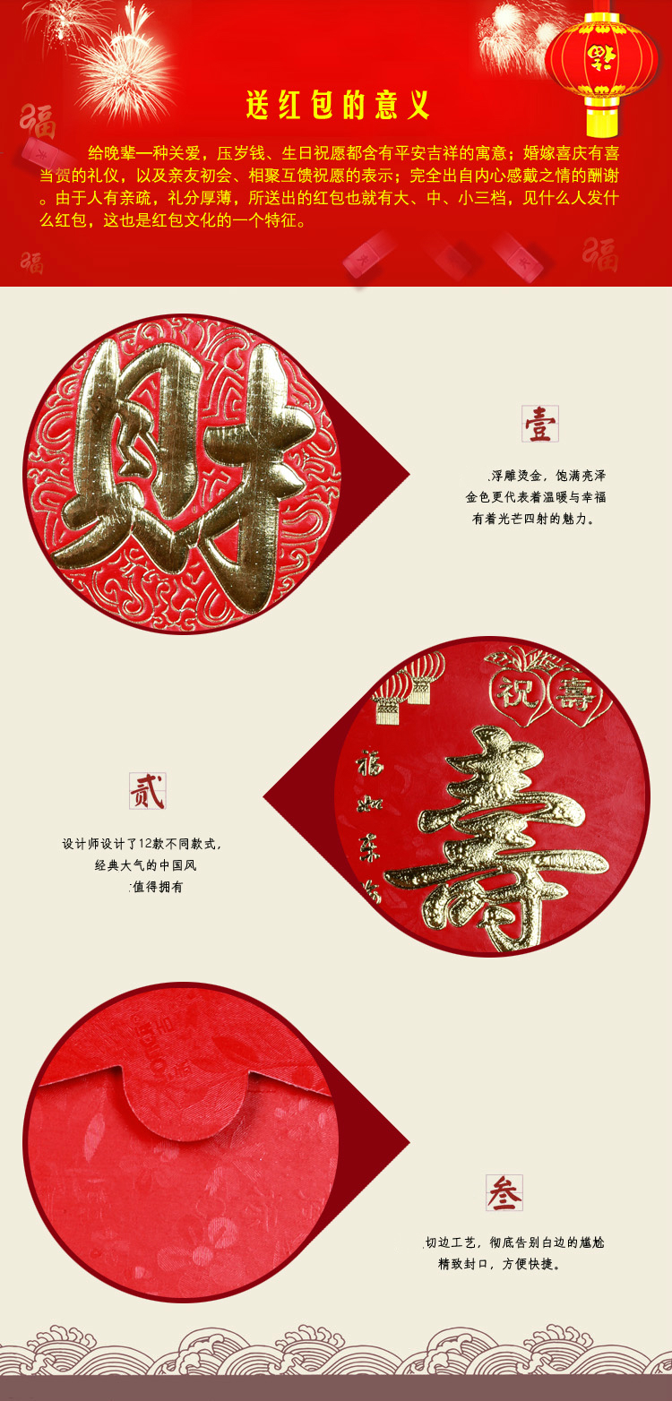Top 2. 偏硬纸质,压花纹路,不会掉色,充足厚实,厂价直销,性价比高,款式多样,任您选择,狗年春节,必备红包。