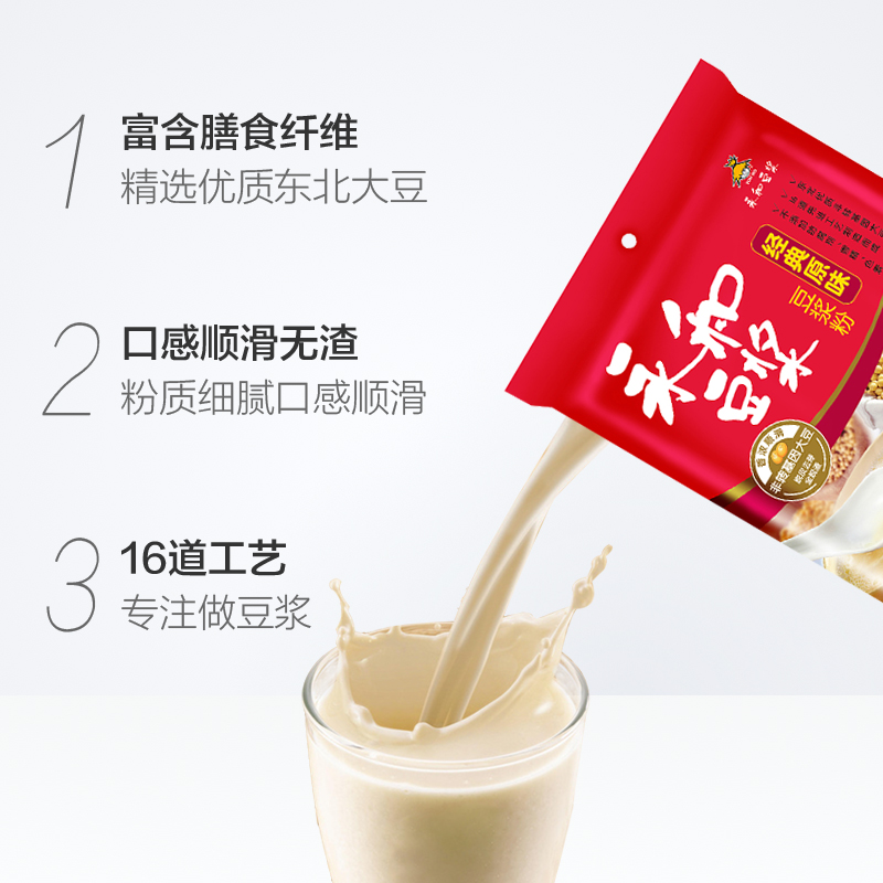Top 2. 即冲即饮熟豆浆,细腻顺滑无渣还原现磨豆浆,富含膳食纤维,精选优质东北大豆,16道工艺,专注做豆浆。